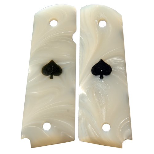 Pair of acrylic pearl 1911 grips with a Black Ace. These will fit all full size Government Issue 1911 and most clones.