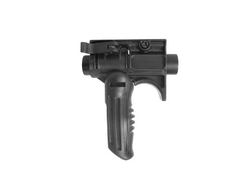 Amazing compact foregrip locks your support hand in place on the weapon. Must be used to be appreciated. Issued to Israeli Special Forces. Transforms from horizontal grip to vertical grip for different shooting applications. In the horizontal position just push grip down to lock in vertical position. Press button to fold back. Safety extension prevents hand from slipping in front of muzzle when mounted on a handgun and locks hand in position on rifles. MIL-SPEC reinforced polymer composite. Disclaimer: If you mount this grip on your handgun, your handgun will be classified as an Any Other Weapon (AOW). You must first register your weapon with ATFE. Be aware that on a Glock or any other polymer handgun, there is a risk that the grip will slide off during shooting because of the flexibility of the handgun's rail.